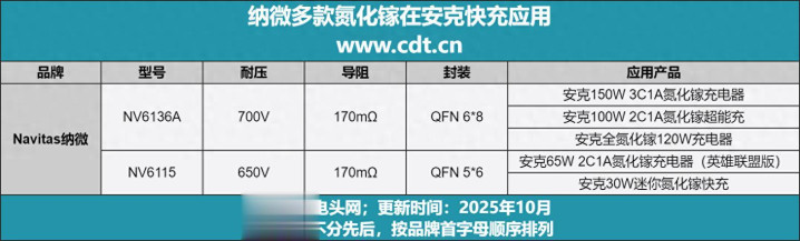小编将文中出现的案例汇总至上表,可见纳微700V耐压NV6136A和650V耐压NV6115获安克多款PD快充应用。